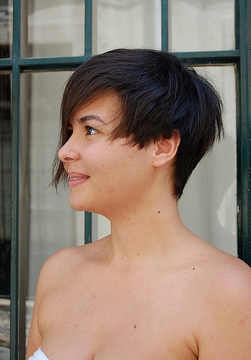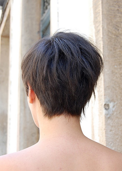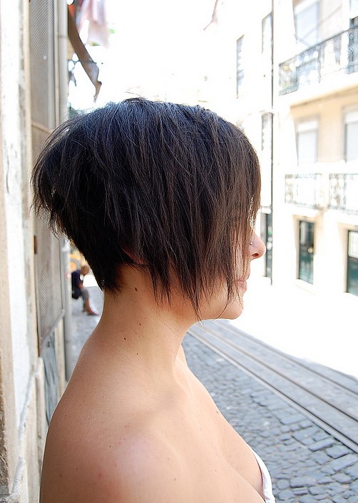This fresh and ultra-chic style is perfect for anyone seeking a trendy and original new look! The hair was razored into short, expertly graduated layers at the nape ending in wispy textured ends. Then the hair above was stack-cut to produce a fabulous bump of volume just behind the crown!