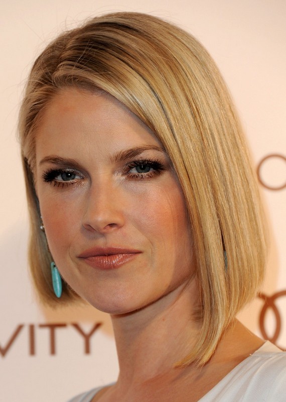 Ali Larter’s angled bob is understated and chic with its classic lines beginning with a classic chin length bob on one side and ending in a longer point just below the chin on the other. This is a great style for a round face as it gives the illusion of a more oval face, and brings out the cheekbones and makes the eyes pop!