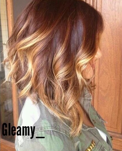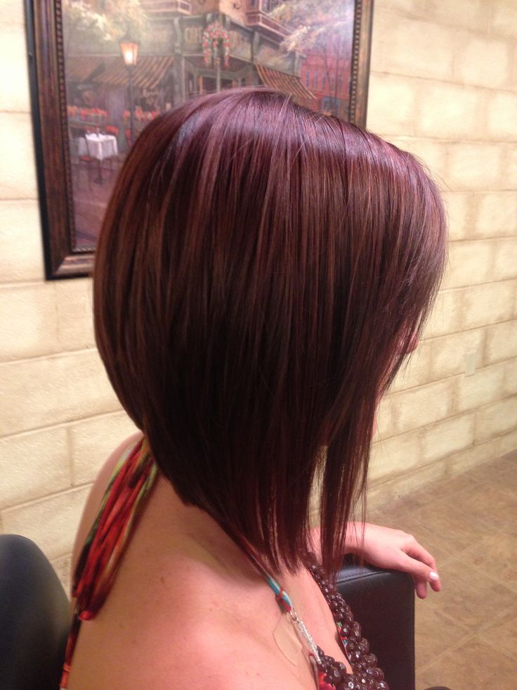 This is one of my favorite bob cut. Long angled bob (A-line haircut) with a dramatic angle and gorgeous golden, mahogany-brown color.