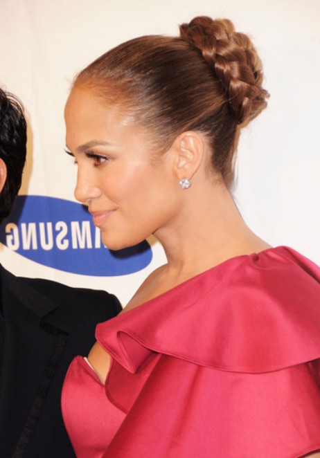 This is a classic braided bun updo hair style. Jennifer Lopez exuded chic elegance with a sophisticated braided bun. She fastened her bun at the crown and twisted her braid around her ponytail.