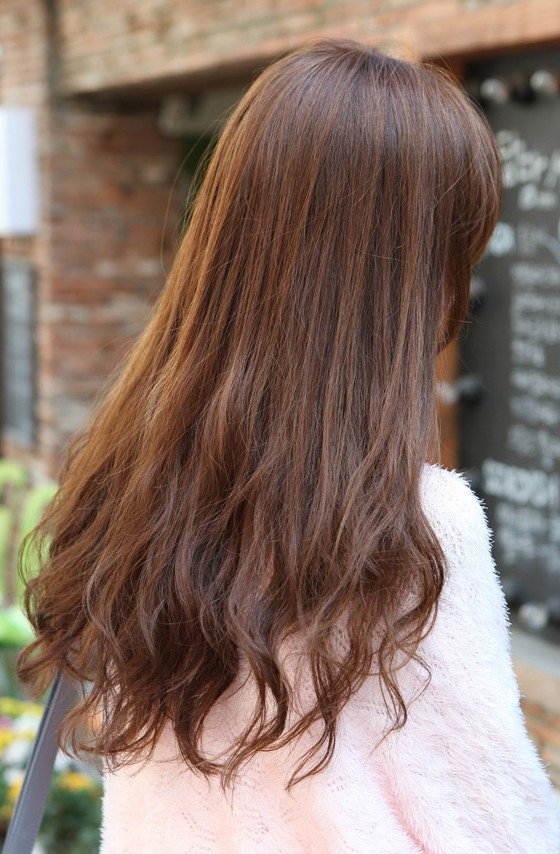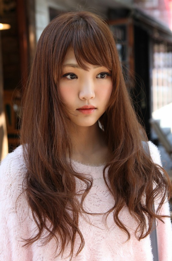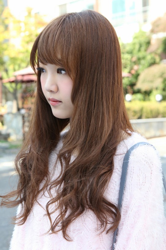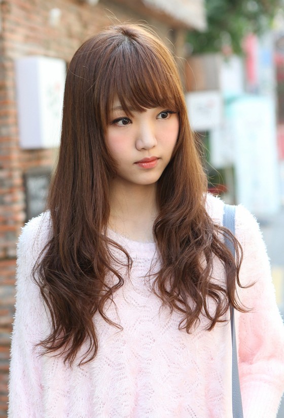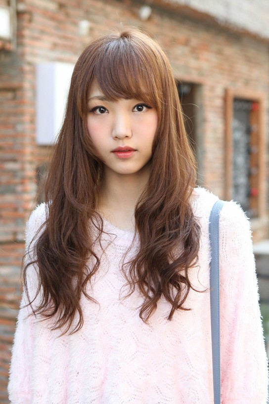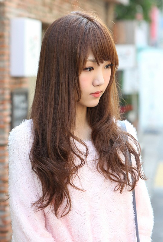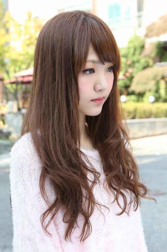 This is a sweet long hairstyle from Korea, if you are looking for a new cute long straight Asian hairstyle, this long brown straight hair with cute bangs is for you.
