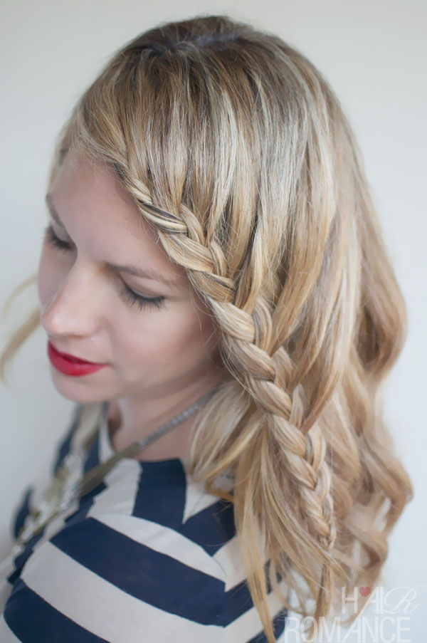From a deep side-parting, the fringe is combed across the forehead and into a stunning French braid, taking in the ends of the hair to form a long braid on one side of the head. Hair from along the side and back is swept forward creatively in edgy diagonal sections, laced into the braid.