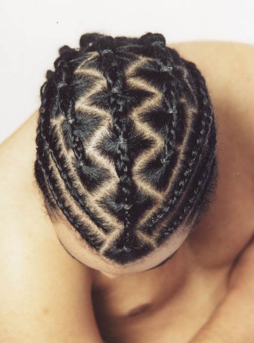 The fourth picture from left above is a simple Ponytail-just pull your Cornrows back and tie at whatever point you desire in the back. A low or “nape” Ponytail is pictured.
