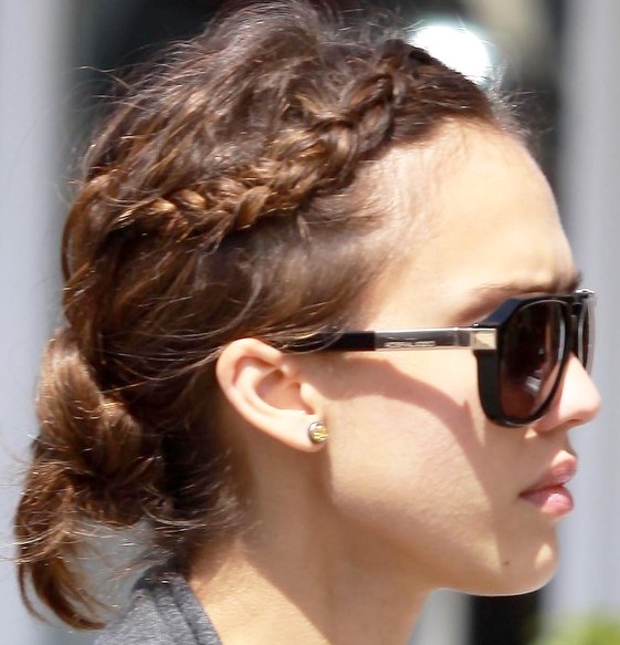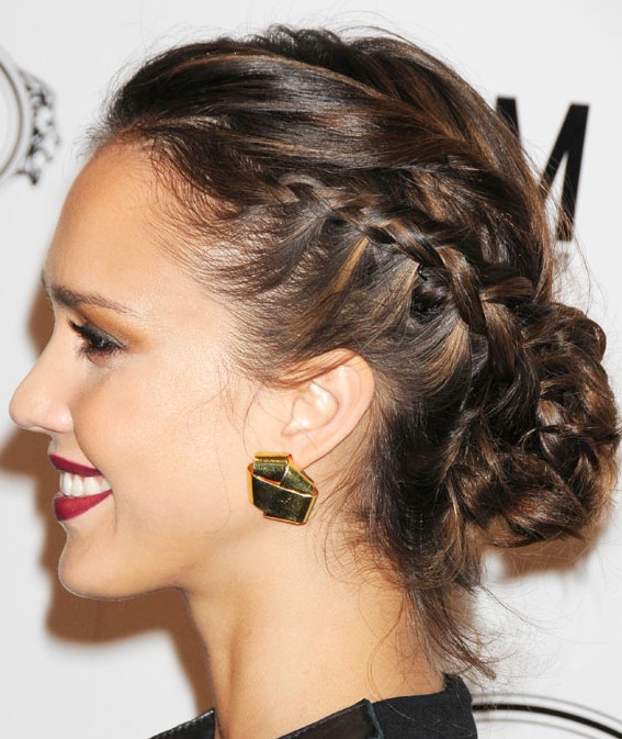 Jessica Alba Hairstyle: This is really a cute braided hair style for medium and long hair. This is a classic hairstyle with the length braided then pinned to the head to form this wonderful shape. A really great hair style for summer!