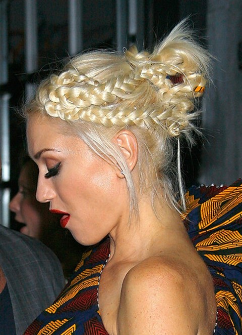Gwen Stefani showed off an intricate braided updo while attending the after party of her latest collection. This updo is easy to re-create and perfect for those with long natural locks.