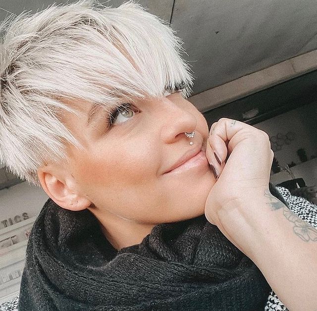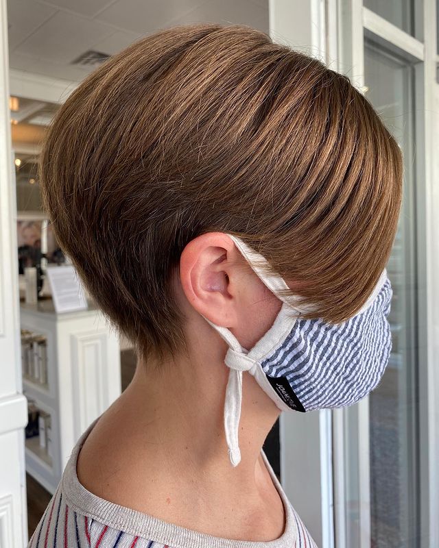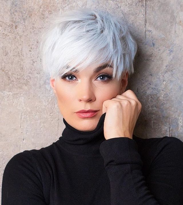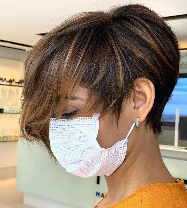 And a layered pixie cut, with long tapering sides covering the sides of the face, add the illusion of more contouring in full cheeks and create a sleeker, longer face shape.