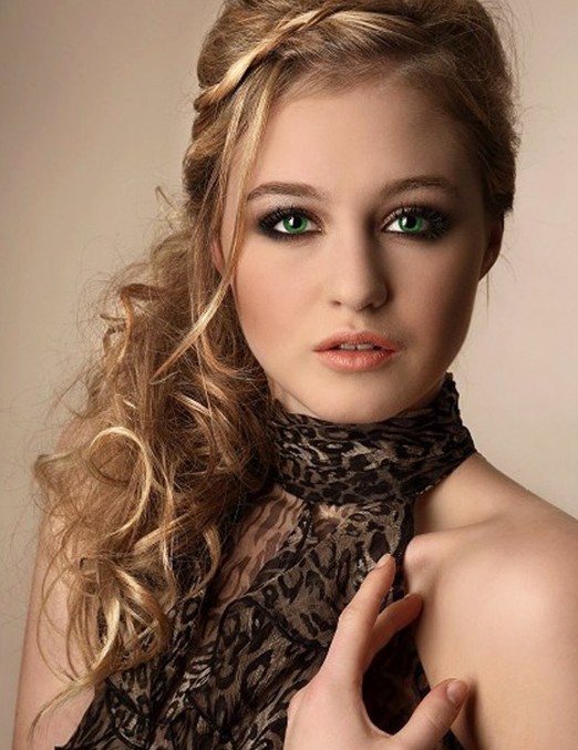 6. For Half Up-Half Down, carefully comb out curls for a sleek look or backcomb them one at a time for a fuller more romantic, flirty look. Place part in hair at the point you desire it to be-then beginning at front of part, take a two-inch section on either side and separate it from the rest of your hair. You may choose to roll it or to braid it. To roll, begin at root rolling against head in the direction the top of your head continue until you have reached the center of the back of your head and secure with band or pin temporarily. Repeat on other side of head- once the two sections meet in the back of your head secure them together in a “non-snag” hair band. To braid, simply apply a traditional braid to each two-inch section, making your way to the center of the back of the head securing as above.
