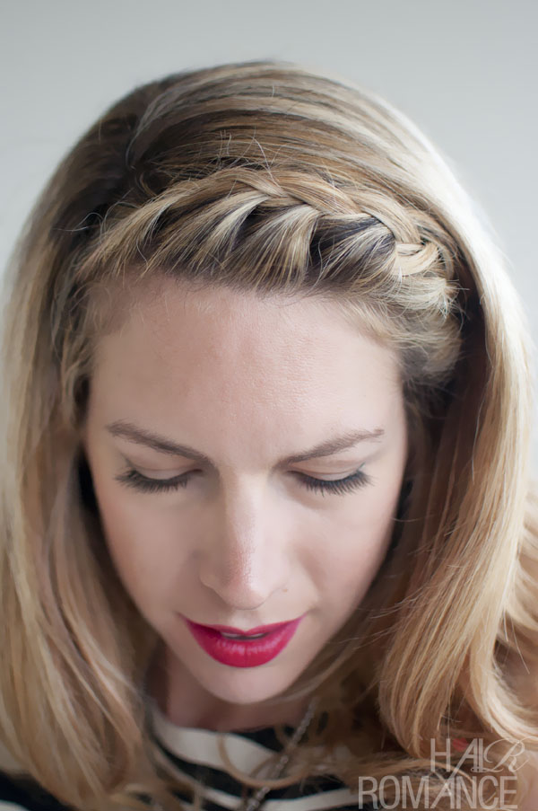 From the side parting, the fringe and front hair sections were French-braided to form a beautiful band following the hairline around the forehead to the other side of the head.