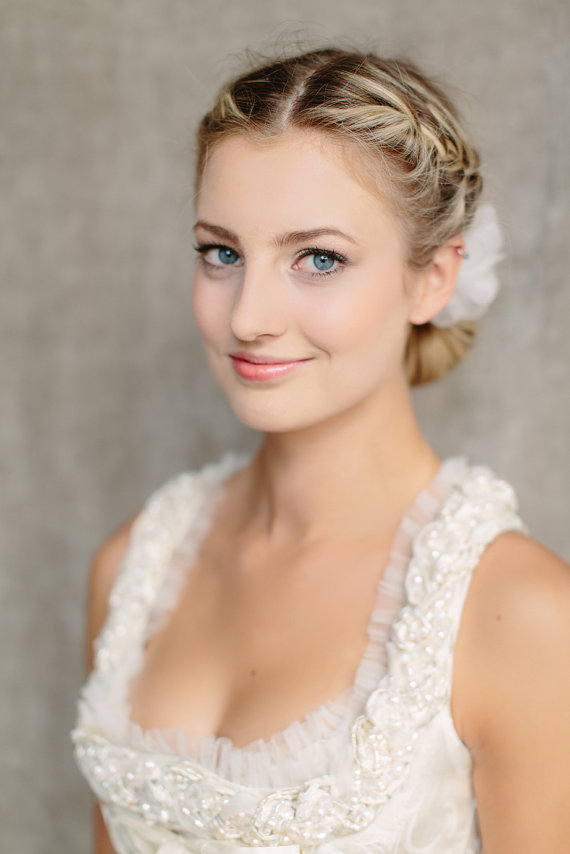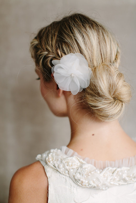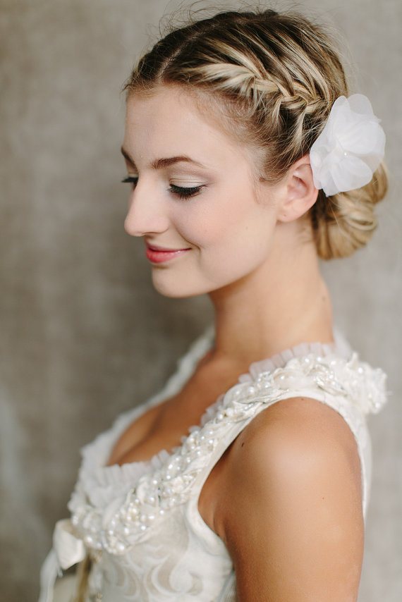 Lovely Low Braided Bun Updo with Beautiful Wedding Hair Silk Flower