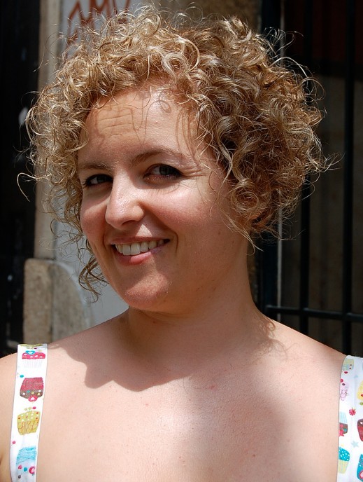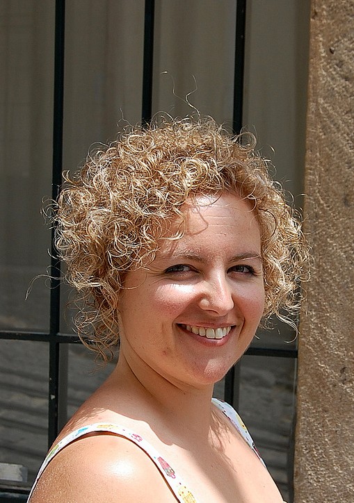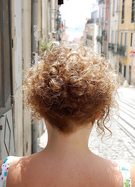 The nape was closely clipped into a very attractive V-shape, which contrasts nicely with the exuberant curly layers above! The bubble curls at the back become slightly longer spirals along one side, ending in pretty wispy ends covering the ear and slightly angled down to frame the face.