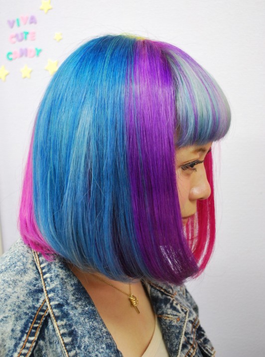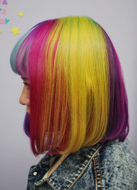 This short bob hair style is blow-waved smooth to frame the face and jaw-line. The bangs are blunt cut and blow-waved straight to frame the face for a stylish finish. I do love these bright colors: pink, purple, yellow, red etc.