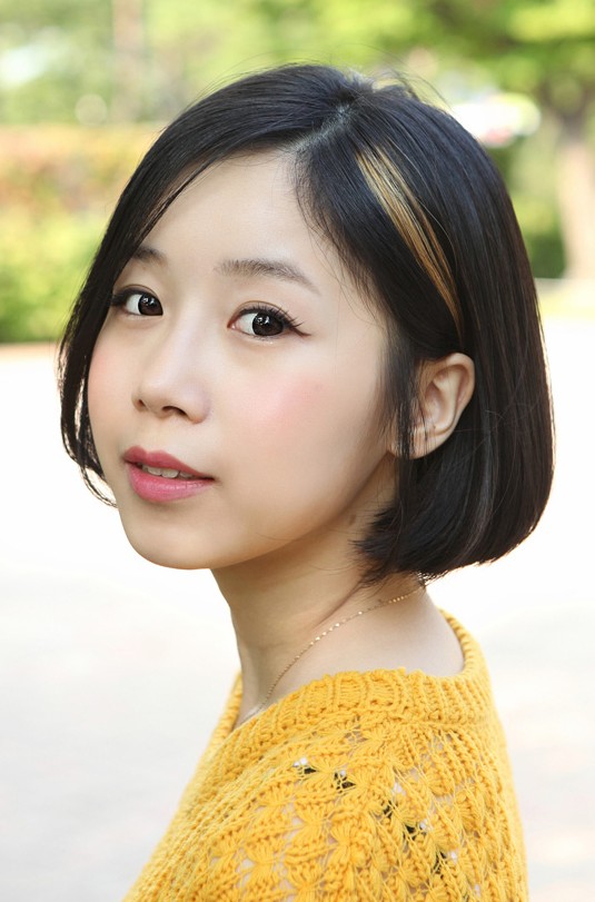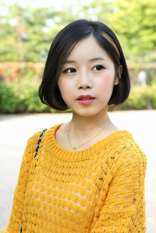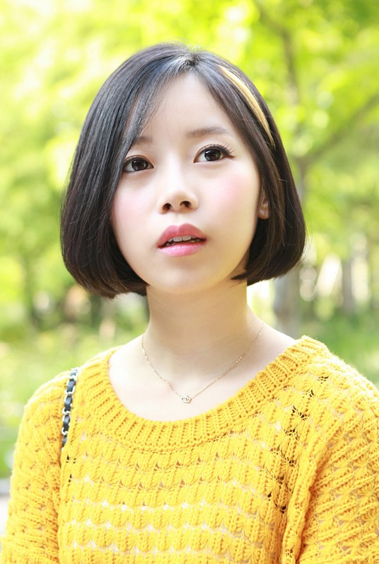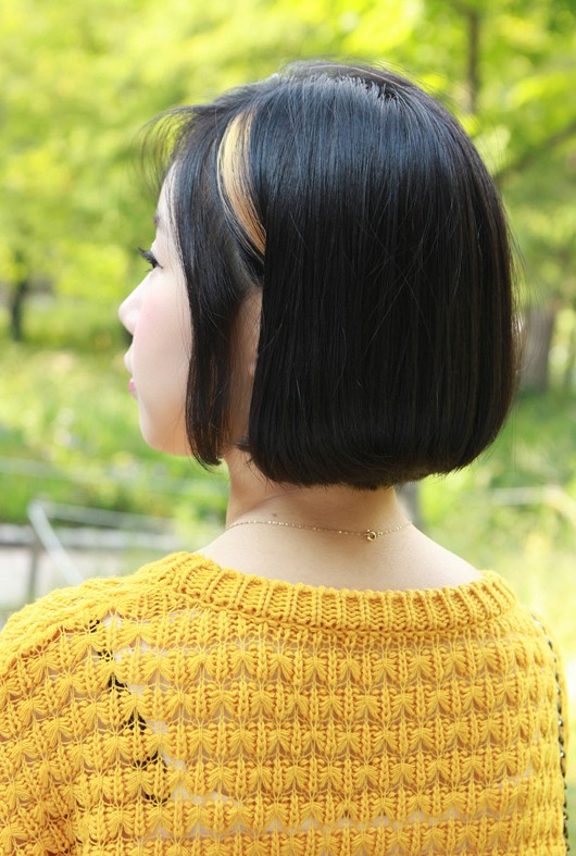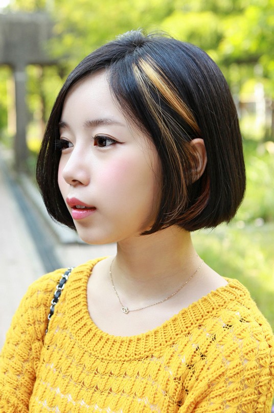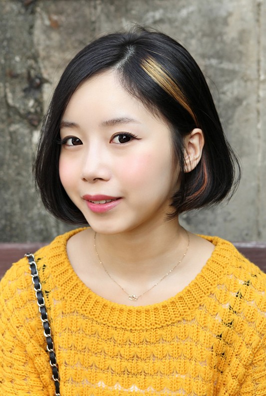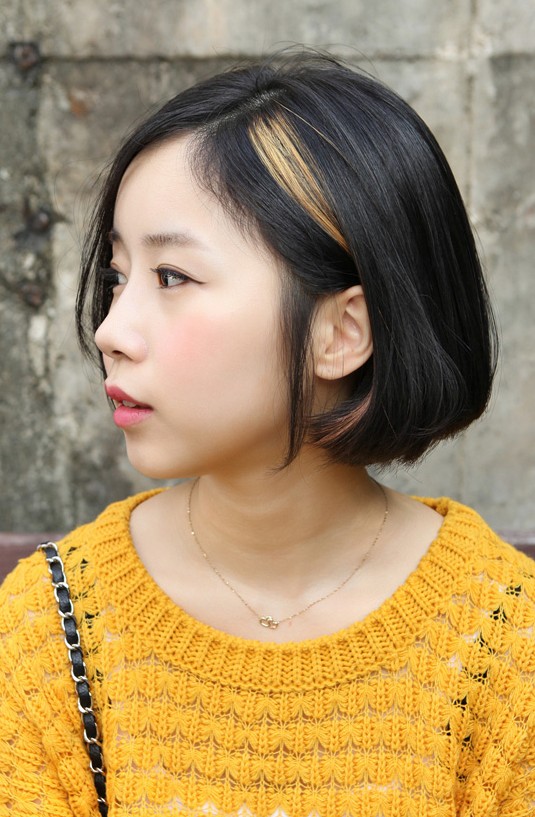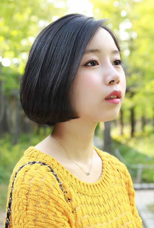 Latest trendy short Japanese bob hairstyle: This short, cute bob was blunt-cut in one-length from a slightly off-centre parting. The front of the hair was styled to make a softly angled asymmetric frame for the face, with the longer side just brushing the client’s cheekbones and curving in at chin level.